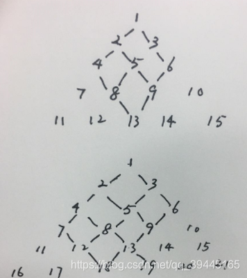 分析题目可以知道这道题目与之前常规的数字三角形题目是类似的,只是这道题目多了一个限制条件就是在向左下与右下走的次数相差是不能够超过1的,其实这道题目解题得到关键点也在这里,后面看了一些网上的思路然后自己画几个简单的例子尝试能够走的路径,最终可以发现答案与我们输入的N的奇偶性是有关的,当输入的N为奇数的时候,最终的答案是dp[n - 1][n // 2],为偶数的时候时候为max(dp[n - 1][n // 2 - 1], dp[n - 1][n // 2]),也就是最中间两个值中的较大值,下面N分别是偶数与奇数的时候可以走的路径(图中的数字表示是第几个的数字),可以发现最终答案是在原来的数字三角形得到的dp数组中最后一行的中间位置dp值。所以根据题目的限制条件可以走的路径就变得有限了。所以有的时候还要根据题目的条件多画画图找找突破口在哪里,画出简单例子的图之后那么就可以找到某些规律
